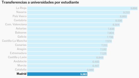 Los cuatro gráficos de este reportaje dejan claro que Madrid está a la cola de financiación por universitario en España, pese a que su consejero de Educación, Emilio Viciana, asegure