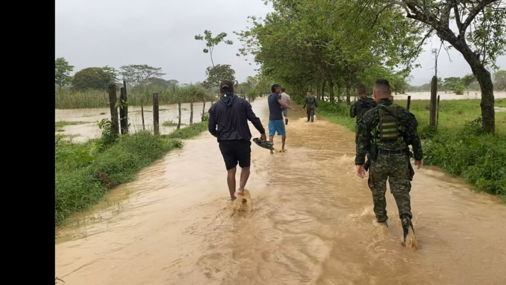 El desbordamiento de varias quebradas impidió el paso entre Montería y Arboletes, con reportes de familias afectadas. Soldados prestan apoyo a las comunidades afectadas por las lluvias. Foto: Cortesía